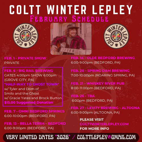Stream my Debut ALBUM, “Coltt Winter Lepley” NOW ON ALL STREAMING SERVICES! VINYL UPDATE!THE NEWEST ROUND OF VINYL HAS ARRIVED! PLACE ORDERS IN ”STORE!” for SIGNED or REGULAR COPIES. TICKETED EVENTS SCHEDULE February PosterVisit the “Schedule” tab for information on “Ticketed events.”***NOW BOOKING 2026*** ROUND 2 of vinYL ORDERS are NOW LIVE! SUBSCRIBE TO "THE HOOTENANNY" Newsletter Join here to be the first for vinyl drop! Sign up with your email address to receive news and updates to join. Email Address Sign Up Thank you!
